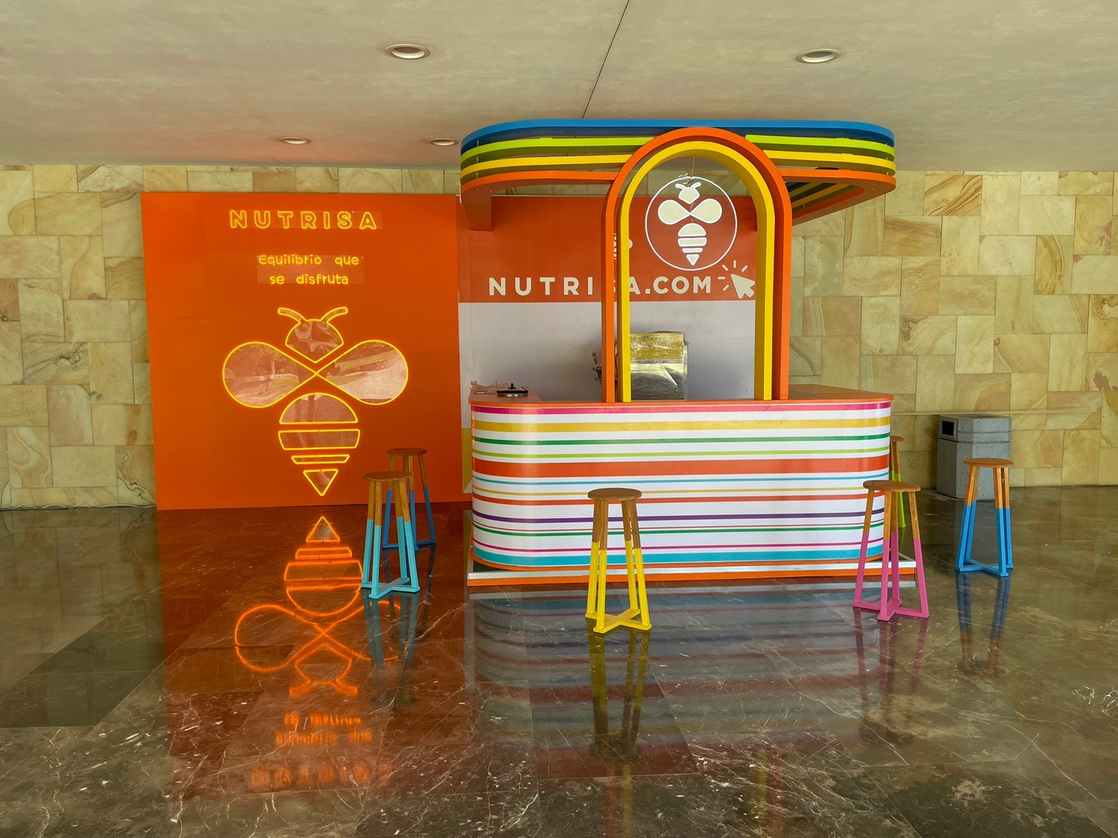 Diseño de stand para Nutrisa enfocado en generar atracción y experiencia de marca, utilizando colores vibrantes, iluminación estratégica y un espacio funcional que impulsa la interacción y las ventas.