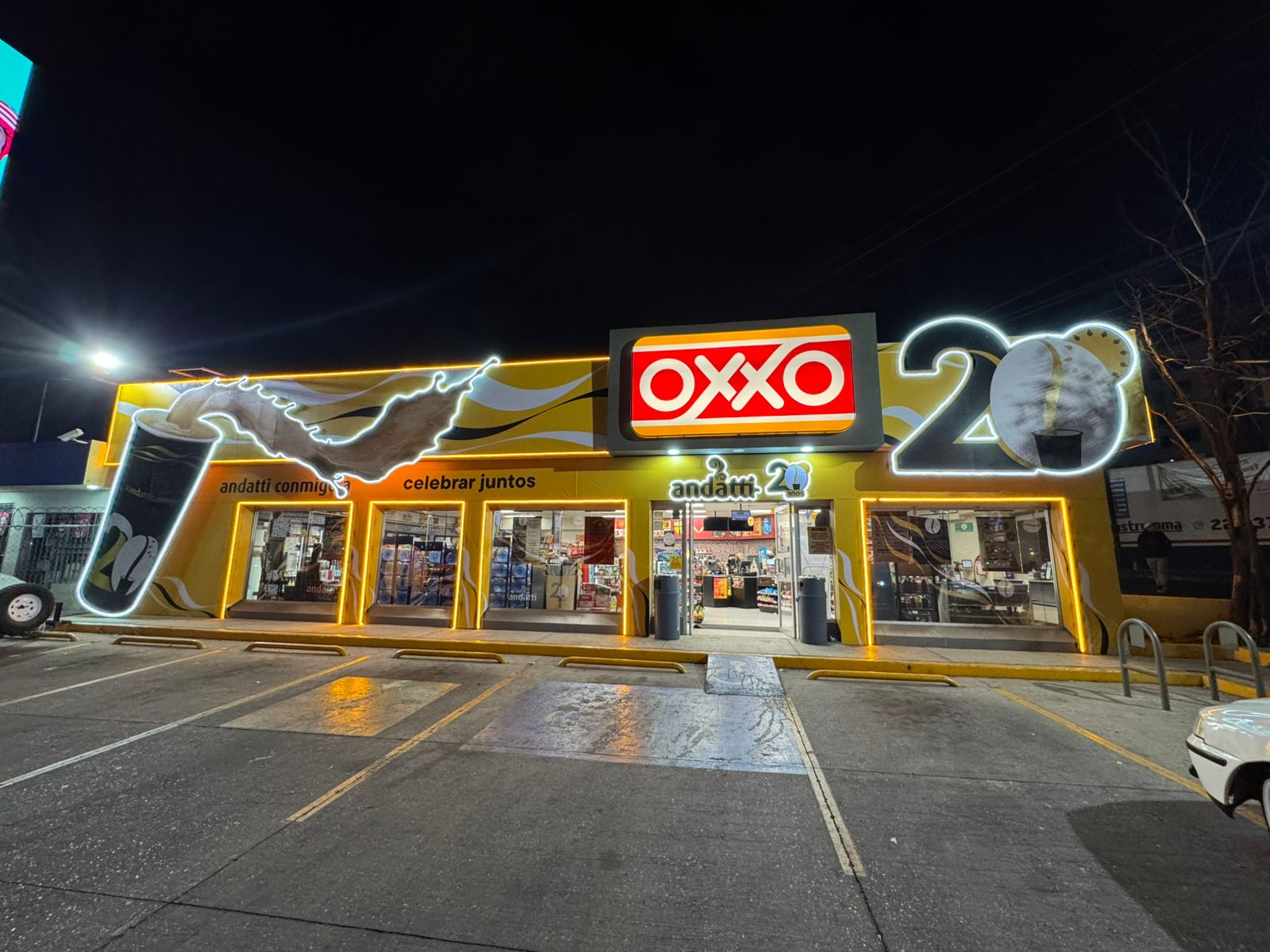 Diseño de fachada comercial para OXXO, con iluminación arquitectónica y elementos visuales de alto impacto que refuerzan la identidad de marca y atraen la atención del cliente desde el exterior.